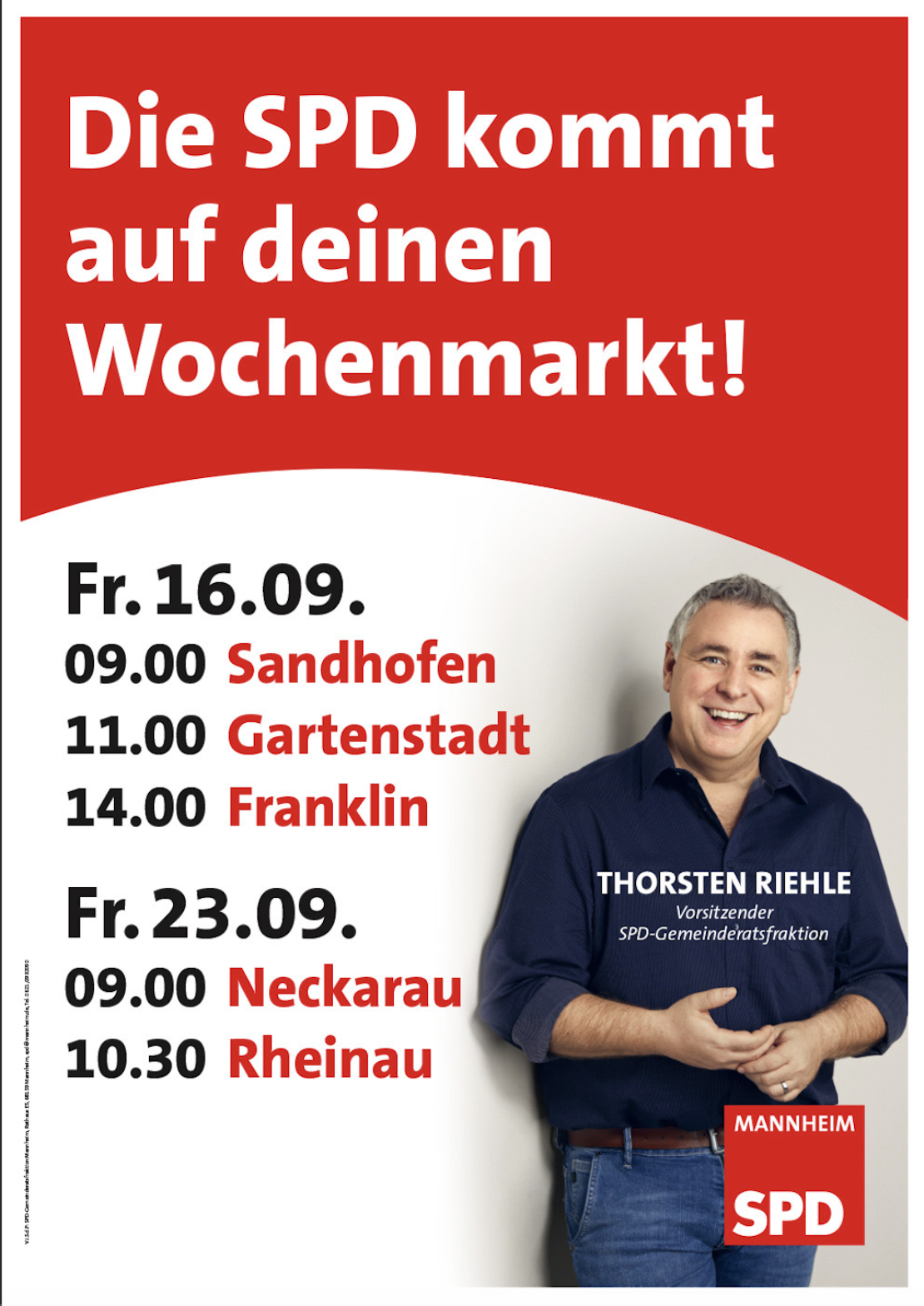 Die SPD Gemeinderatsfraktion Mannheim und ihr Fraktionsvorsitzender Thorsten Riehle sind diese Woche vor Ort in Neckarau. Kommen Sie ins Gespräch mit den Sozialdemokraten.
