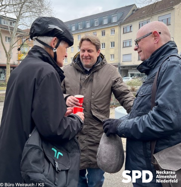 Die Neckarauer Sozialdemokratinnen und Sozialdemokraten nutzen die Gelegenheit, am Freitag, den 14. März, um mit Bürgerinnen und Bürgern ins Gespräch zu kommen. Gemeinsam mit ihrem Landtagsabgeordneten Dr. Boris Weirauch und Stadtrat Dr. Bernhard Boll suchten sie während des Wochenmarkts auf dem Marktplatz im Herzen Neckaraus den Austausch.