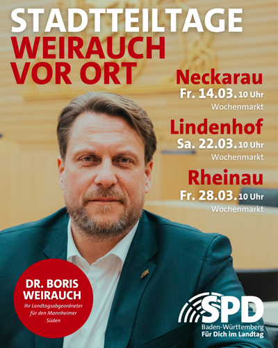 Der SPD-Landtagsabgeordnete für den Mannheimer Süden Dr. Boris Weirauch lädt regelmäßig zu seinen Stadtteiltagen ein, um mit den Bürgerinnen und Bürgern vor Ort ins Gespräch zu kommen. Am 14. März besucht er den Wochenmarkt in Neckarau von 10 - 12 Uhr, um sich direkt über aktuelle Anliegen, Herausforderungen und Ideen auszutauschen. Mit dabei sein wird der Neckarauer SPD-Stadtrat Dr. Bernhard Boll.